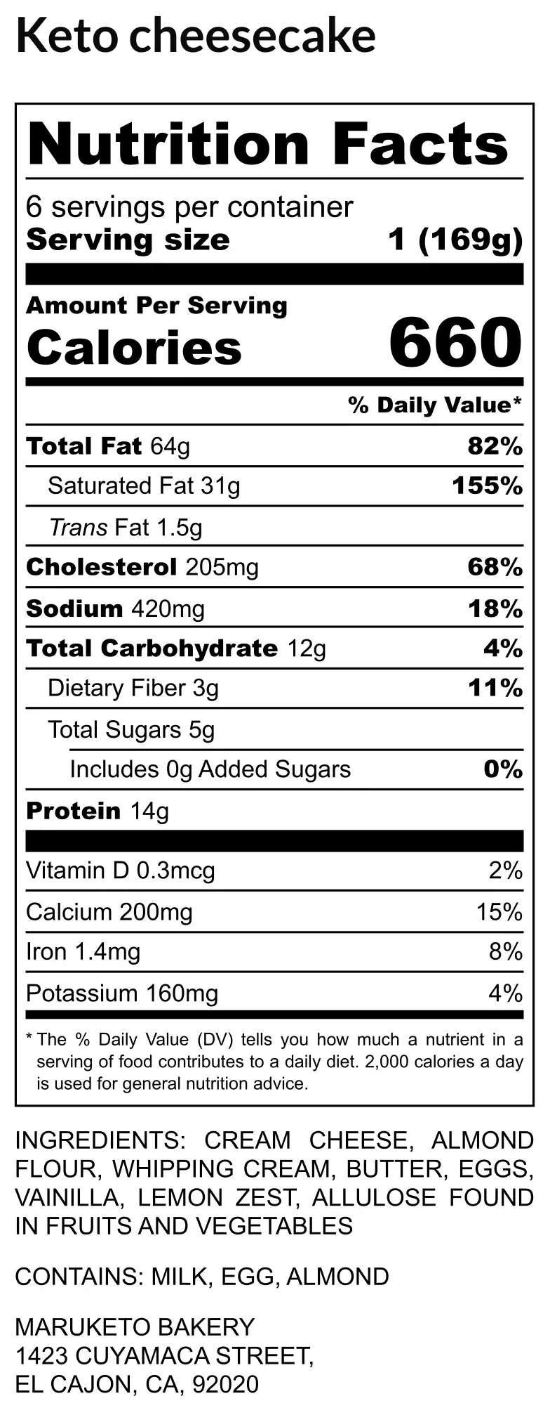 CREAM CHEESE, ALMOND FLOUR, WHIPPING CREAM, BUTTER, EGGS, VAINILLA, LEMON ZEST, ALLULOSE FOUND IN FRUITS AND VEGETABLES.